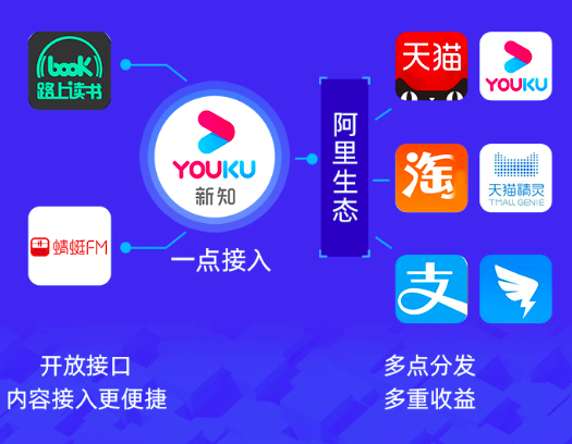 此外,优酷内容开放平台的知识付费产品新知,也在此次产品迭代中获得升级,实现了“开放平台一点接入,阿里体系多点分发”,即蜻蜓FM、路上读书等合作伙伴可通过端口的形式,将其平台节目批量上传至优酷内容开放平台,进而优酷内容开放平台将该节目同步分发至优酷、淘宝、天猫、支付宝、天猫精灵、钉钉等多个阿里生态入口,帮助内容方获得多重分账收益。