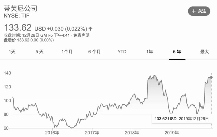 今年以来,Tiffany股价已累计上涨63%,截至昨日收盘股价133美元,市值约为160亿美元