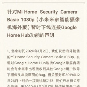 针对该消息,微博认证为“小米公司发言人”的账号发布声明,声明内容显示,针对Mi Home Security Camera Basic 1080p(小米米家智能摄像机海外版)暂时下线连接Google Home Hub功能。国内用户与所有使用米家APP平台与小米米家相关摄像头的用户(包括中国和海外用户)不受影晌。