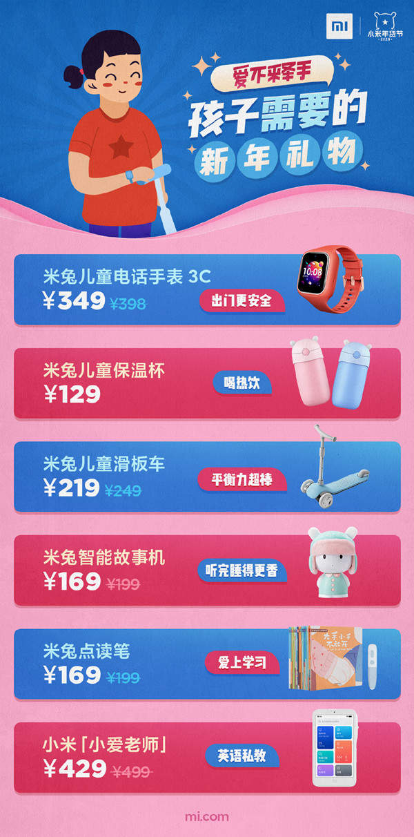 除此之外,米兔儿童电话手表3C原价398元,现价349元;米兔点读机原价199元,现价169元;米兔儿童滑板车原价249元,现价仅需219元。