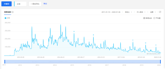 纵观小米的成长历史,其热度与业绩表现呈现一定的正相关关系。大的走势来看,2011年至今,“小米”的百度搜索指数是先增后降,转折点出现于2014年。