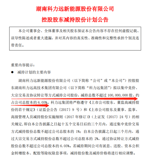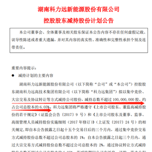 财联社1月15日讯,昨日晚间,科力远发布公告,控股股东科力远集团拟三个月内以集中竞价、大宗交易及协议转让等方式减持公司股份,减持总数不超过1亿股,约占公司总股本的6.05%。