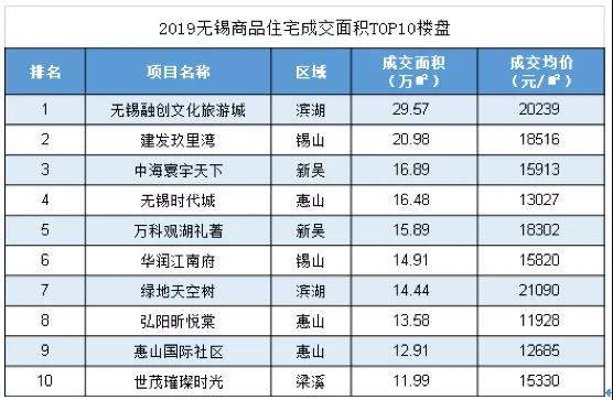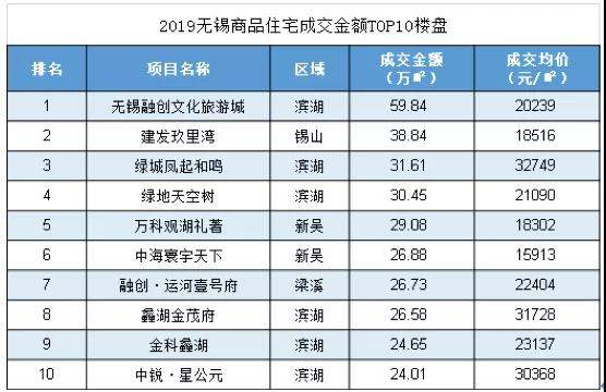 回顾2019年的无锡楼市,或波涛汹涌,或波澜不惊,或高歌猛进。但不管市场如何变化,产品力才是生命力。在商品房销售面积前十名的榜单上,滨湖区上榜楼盘最多,无锡融创文化旅游城、绿地天空树、蠡湖金茂府、金科蠡湖共4个楼盘上榜。其中位居第一位的无锡融创文化旅游城,全年平均每天卖出7套房子,总计全年卖出29.57万平米,总金额达59.84亿元,无论是成交面积TOP10榜单,还是成交金额TOP10榜单,都一骑绝尘,远超第二名。作为建发地产首入无锡的项目,玖里湾以江南新中式园林大宅面市,一下子就赢得了挑剔的无锡购房人的欢心与青睐,以20.98万平米的成交面积,和38.84亿元的成交金额,稳居第二。