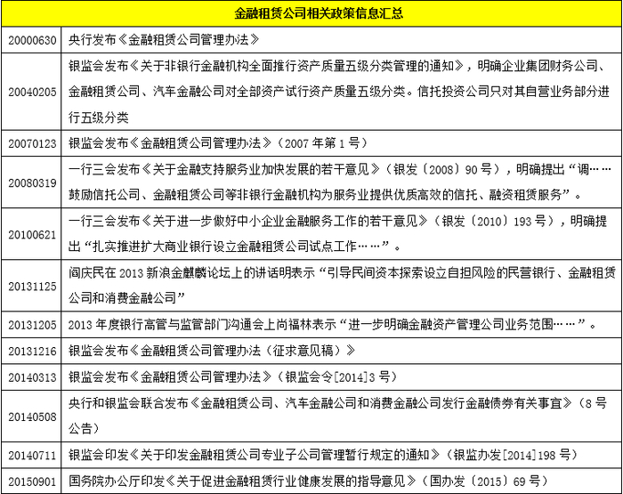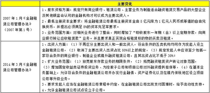 截止目前,关于金融租赁公司整体的监管政策主要有三个,一是2000年6月央行发布《金融租赁公司管理办法》,二是2007年1月银监会发布的《金融租赁公司管理办法》(2007年第1号),三是2014年3月银监会发布的银监会发布《金融租赁公司管理办法》(银监会令[2014]3号)。这三个政策文件实际上能够体现出监管政策导向上的一些变化。
