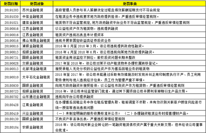 我们汇总了所有与金融租赁公司相关的处罚案例(合计共30个),归纳发现监管处罚案主要集中在以下几个方面。