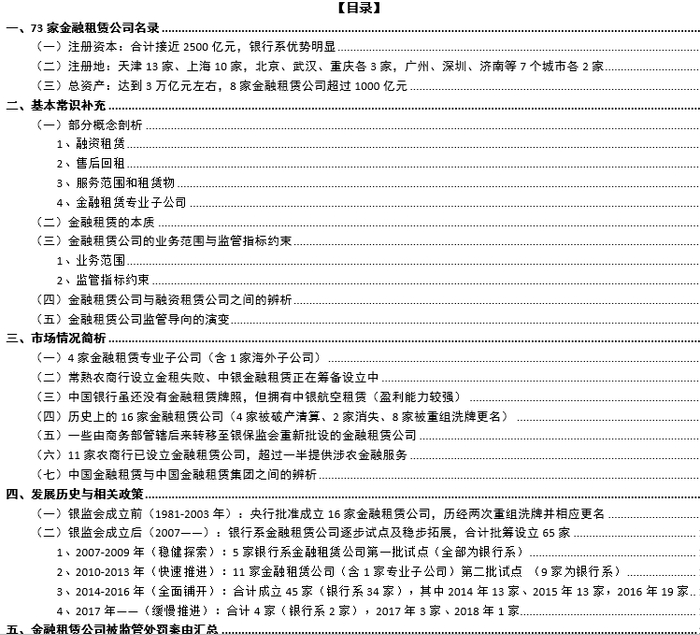 继券商(全面剖析132家券商(含19家资管子公司))、基金(一文读懂基金行业与145家公募基金管理机构)、AMC(一文读懂4家全国性AMC与60家地方性AMC)、类金融(一文读懂类金融机构)、消费金融公司(一文读懂27家持牌消费金融公司)之后,本篇报告聚焦73家金融租赁公司与金融租赁行业。