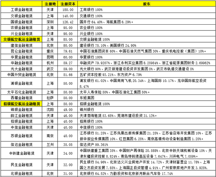 其中,超过100亿元的金融租赁公司有3家,分别为工银金融租赁(180亿元)、交银金融租赁(140亿元)、国银金融租赁(126.42亿元);注册资本在50-100亿元之间的金融租赁公司有13家。