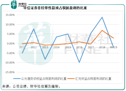 以中信证券(06030-HK, 600030-CN)为例,由于这些非经常性项目为账面盈利或亏损,所涉及的运营开支或费用/收益极低,我们直接用其来进行税前盈利的对比,见下图。2018年,公允值变动收益相当于税前盈利的13.69%(按中国会计准则编制报表,下同),而到2019年前三季,这个比值为-2.01%,由此可见这些款项波动很大,因为本来就不存在可持续性,很容易扭曲盈利表现。