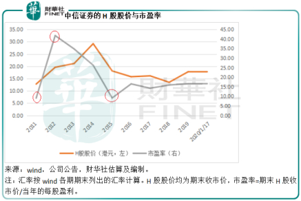 从上图可见,如果在每股净资产偏离H股股价最大时(例如2014年)卖出(这时的市净率为2.56倍),可以避过后来的股价下跌。类似地,如果在2018年H股股价低于每股净资产值时买入(这时的市净率为0.94倍),可以把握到随后的上涨。以此来看,中信证券在港股市场上市这些年,市净率看来是不错的投资信号。