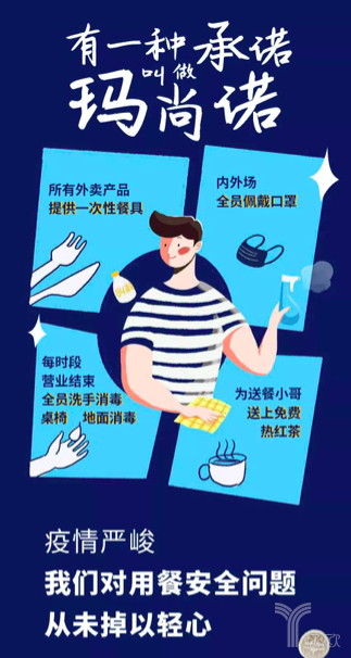 此外,玛尚诺还为所有外卖产品提供一次性餐具,每时段营业结束,全员洗手消毒,桌椅地面消毒,内外场全员佩戴口罩。