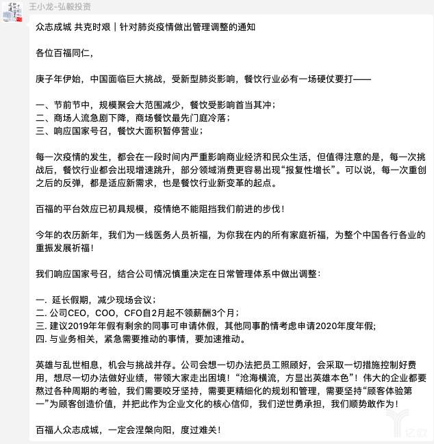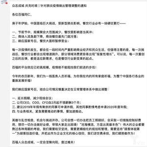 此后武汉封城,我意识到这个情况比预料到的可能还要严重得多。所以回京以后,初二、初三我们已经制定了一系列的应对方案。我作为百福CEO,主动提出来,三个月工资不拿了。很快,我的管理团队,CFO他们都不拿工资了。这个时候真的是很困难。