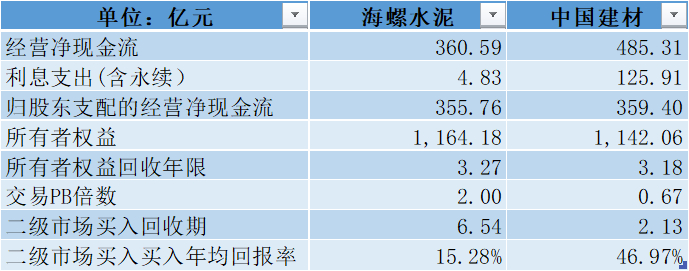 经过测算,海螺的归股东支配的经营净现金流为355.76亿,海螺的回收时间是3.27年;中国建材的归股东支配的经营净现金流为359.40亿,而中国建材的回收年限是3.18年,显然从这个角度来说,中国建材的股东回收期更短。但是无论海螺还是中国建材,其股东权益的现金回报率均为30%以上!