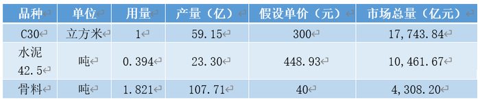 众所周知,水泥仅仅是半成品,需要使用还要加入骨料和辅材形成混凝土。以一立方C30强度混凝土做假设,水泥PO42.5以2019年全国全年平均价格448.93元/吨和2019年度水泥产量23.30亿吨作为计算依据,可以得出骨料的全国总市场在4300亿元、混凝土市场全国总量在1.7万亿元左右。