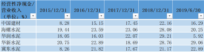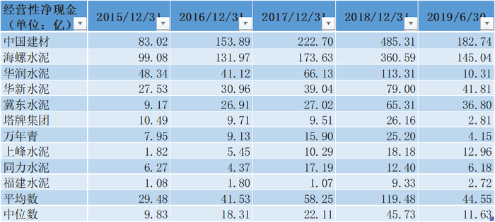我们将各水泥公司的经营性净现金流数据做下比对: