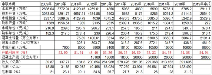 2019年领跑的中联水泥产能达到8270万吨,外销3200万吨骨料的同时,也带动了中联集团混凝土销售的快速增长。
