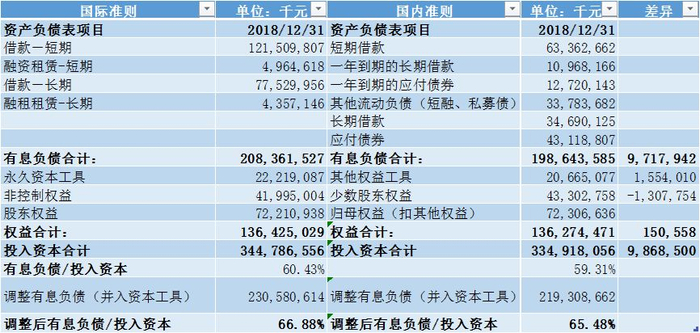 为了更加易于比较,我们采用有息负债的统计方式。由于采用的会计准则及披露口径不同,经过比较,我们决定采用数字更加保守的国际准则来确认有息负债,并把永续债从权益项调整为负债项。