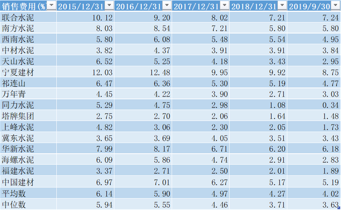 销售费用主要是水泥运输、包装物及装卸费用,取决于先天的磨粉站布局和优势交通工具,如航运和铁路等。由于联合水泥和南方水泥混凝土、骨料较多,导致运费占比较大,西南水泥处于四川、云南、贵州,区域决定运输费用较高,可比公司为华新水泥。针对该项费用,可改进措施无非是优化位置、增加航运;中国建材创新采用了皮带运输来降本增效,但总体空间不大。