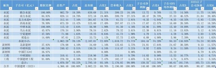 子公司中材水泥、祁连山、天山股份、宁夏水泥目前财务状况优良,负债率低,在未来两三年内基本可以成为净现金状态公司,现在都在积极拓展轻资产的水泥+产业。