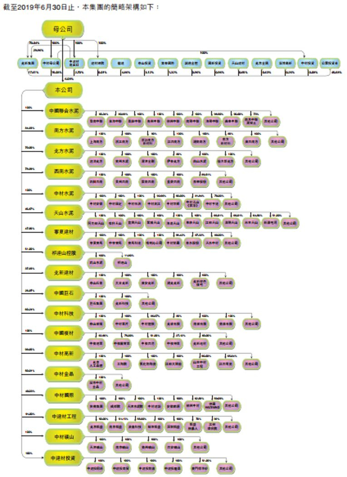 中国建材业务板块较多, 仅采用公司列报数据与海螺做简单对比,可能得出的结论与实际情况相去甚远,再做比较分析前,先把公司架构和业务板块数据拆分以供参考。集团公司架构如下: