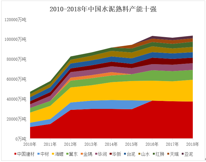 到2016年,中国建材基本上完成了全国性的战略布局,到2018水泥产业结构逐步优化。前10家水泥企业(集团)熟料产能集中度已达64%,比2015年提高12个百分点,中国建材和安徽海螺水泥总产能分别为5.3亿吨和3.35亿吨,居世界第一和第三名。