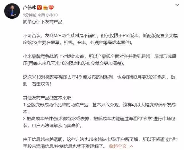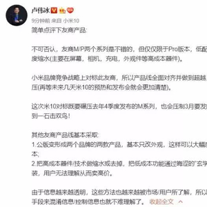卢伟冰率先承认华为的P系列和Mate系列的机型是不错的,但仅限于高配的Pro版本。低配的版本会大幅度缩水,主要表现在屏幕、相机、充电、外观等成本较高的元器件之上。小米品牌战略上对标华为,所以产品线全面对齐并做到超越,局部还会形成碾压之势,未来几天小米10的预热和发布就会更加清楚。他特别强调这一次的小米10不仅要碾压华为Mate 30系列,也要压制即将在3月份发布的华为P40系列,做到一石二鸟。