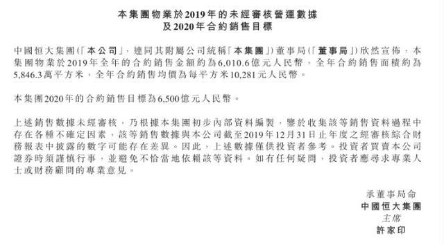 1月2日,恒大发布2019年全年业绩数据,公司全年合约销售金额约为6010.6亿元,同比增长9%,全年合约销售面积约5846.3万平方米,同比增长11.50%。这也是公司合约销售额增速首次跌至个位数。