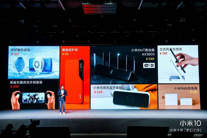 发布会上,除了发布小米10以及小米10Pro外,还发布了内置30W无线闪充的小米无线充蓝牙音箱、小米首款WiFi6路由器、 黑鲨双翼游戏手柄套装小米10定制礼盒、冰封散热背夹、小米10翻盖保护壳、小米GaN充电器 65W、立式风冷无线充7款配件。