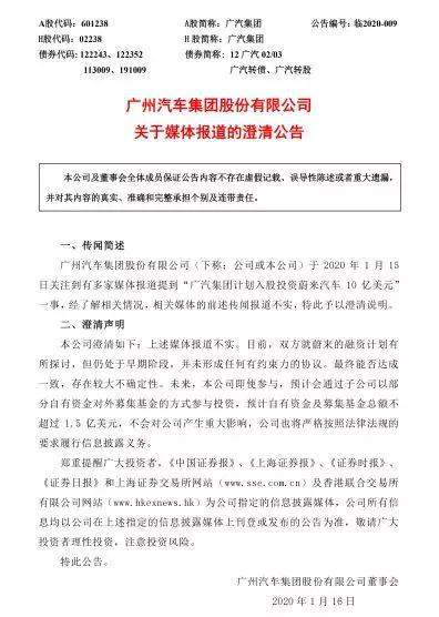 “广汽入股蔚来10亿美金”的消息也曾一度沸沸扬扬,但不久后广汽集团便发布澄清公告,表示双方目前对融资事宜却有探讨,但尚处于较早阶段,存在较大不确定性。同时,总募资金额也并非坊间流传的“10亿美金”,而是通过子公司对外募集基金的方式投资不超过1.5亿美元。