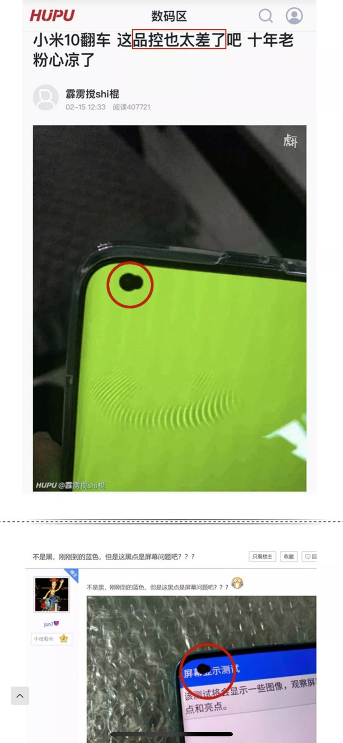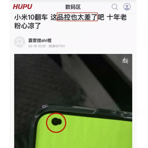 而小米10发布之后并不平静,随着小米首批货源陆续到达消费者手中,微博有网友总结了品控翻车、屏幕左上角前置摄像头存在黑点、黑屏、闪屏以及屏幕混用(网友发现华星光电屏)一亿像素放大后没有普通拍照的清晰、5G 断网等反馈。