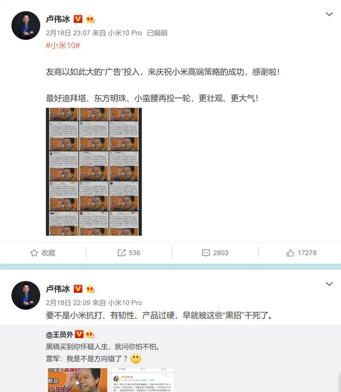 小米则将指出产品问题的用户定性为“海啸”,这引发了微博、产品论坛的用户互怼。此后,商业评论发布了《小米能成高端机吗?》的视频解读,指出小米10新品价格直冲6千,配置一流,但大都只是首发不是独占,后来者vivo、OPPO也能快速跟上。引发了大量微博大V的转发,而卢伟冰却连发微博,将锅扣到友商身上,暗指背后是友商黑招操作。