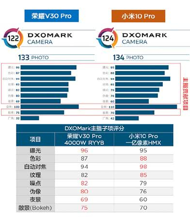 日前@荣耀老熊在微博上表示,他们把DxOMark中荣耀V30 PRO和小米10Pro相机拍照的各项评分打开看了一下,小米10 Pro拍照比荣耀V30 PRO高一分,这一分主要的贡献来自长焦和广角。但是主摄贡献的八项评分中,荣耀V30PRO五胜,其中噪点、伪像、夜景、散景(大光圈)遥遥领先小米10 Pro。