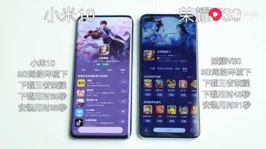 而微博数码达人通过视频测试,同时下载王者荣耀游戏,荣耀V30下载用时43秒,安装用时21秒;小米10下载用时65秒,安装用时28秒。