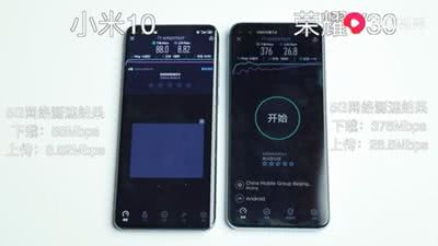 在软件测速上,荣耀 V30 的下载测速是小米10的4倍,上传速度是3倍。