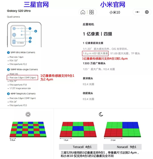 其二,小米的亿级像素用的是三星HMX四像素合一旧版本,而非三星升级过的HM1九像素合一新版。