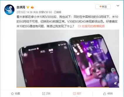 墨菲定律说的是越担心什么,就越来什么。日前微博原创视频博主古渡月视频测试发现:小米10 5G连接不稳定,同在一个网络环境中,荣耀V30保持稳定的连接状态,但小米10连接5G网络无法上网,频繁跳至4G网络。