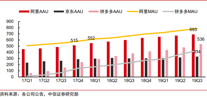 中国电商行业充满惊喜,黑马拼多多异军突起。最新的可比数据显示,19年第三季度拼多多的年购买用户(AAU)达5.36亿人,约为阿里同期6.93亿人的77%,接近阿里 2018Q1 水平,早在18年二季度超越京东。