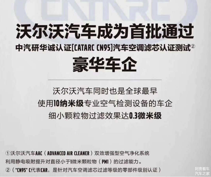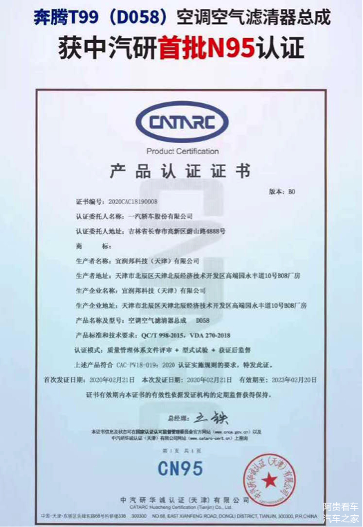 作为国内目前唯一具有"车规级CN95空滤"认证资格的权威机构,中汽研华诚认证中心是国家认监委指定的强制性产品认证机构,此次发布的"CATARC CN95"认证也是目前汽车空调滤清器的最高等级认证,其中C代表"Car",N95代表达到了医用N95型口罩级过滤效果。