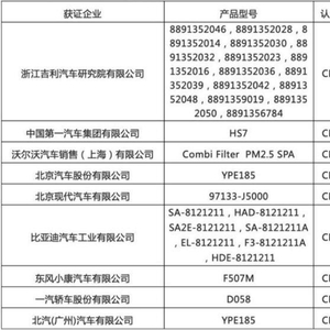 日前,根据《CATARC标志认证实施规则 汽车空调滤清器过滤等级》规则,中汽研华诚认证(天津)有限公司(以下简称“华诚认证”)公布已完成认证的首批产品。据公告,本批次共有9家企业申请的9个认证单元空调滤清器产品通过认证,并获得最高等级“CN95级”认证证书。包含吉利汽车、中国一汽、沃尔沃汽车、北京汽车、北京现代、比亚迪等多家汽车企业,其中吉利汽车成为国内首家(001号认证)获中汽研官方最高级别认证的车载空调滤芯产品。