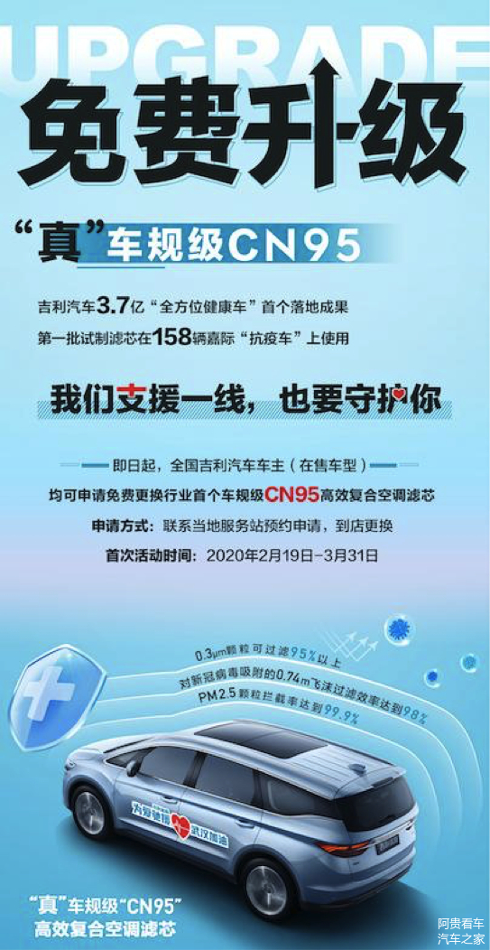 此外,吉利汽车旗下首批装配"车规级CN95空滤"的158辆嘉际已捐赠给武汉、晋中、贵州、台州等地。同时,吉利品牌、领克品牌与几何品牌的所有在售车型,均可参与免费更换"车规级CN95空滤"的专项升级活动,只需3月31日前联系当地服务站预约申请即可。