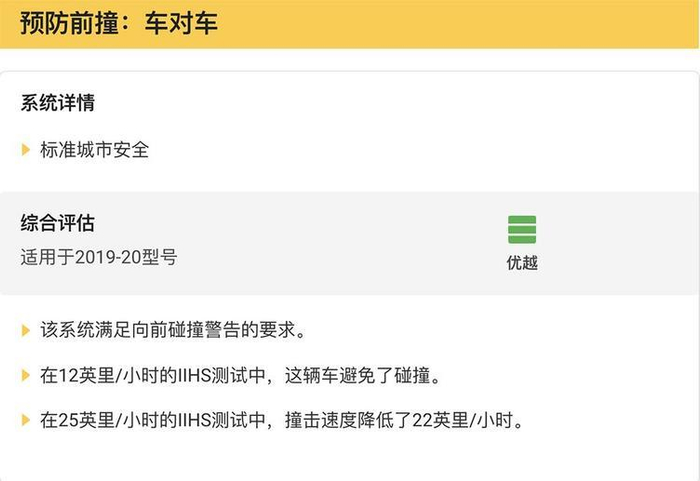 在IIHS,想要获得“TOP SAFETY PICK+”顶级安全评价,除了车辆要在5个项目碰撞测试中取得优秀评级外(包括正面25%偏置碰撞、正面40%偏置碰撞、侧面碰撞、车顶强度和座椅鞭打试验),还要在在碰撞预防系统评测中获得“Superior”(优秀)或者“Advanced”(高级)的评级。