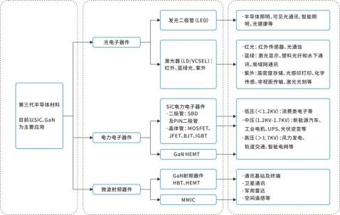第三代半导体材料主要以碳化硅(SiC)、氮化镓(GaN)、氧化锌(ZnO)、金刚石、氮化铝(AlN)为代表的宽禁带(Eg》2.3eV)半导体材料。第三代半导体中,碳化硅(SiC)和氮化镓(GaN)是核心。前者目前应用更广泛,后者被寄予厚望。