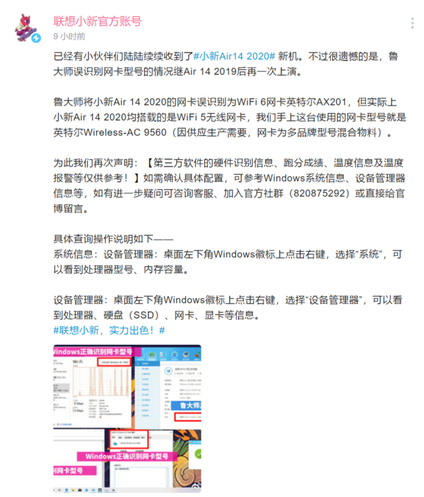 为此联想小新官方账号发布声明称,小新Air 14 2020均搭载的是WiFi 5无线网卡,因供应生产需要,网卡为多品牌型号混合物料,示例机使用的网卡型号为英特尔Wireless-AC 9560。这不是鲁大师第一次弄错硬件配置了,此前鲁大师就误读了Air 14 2019的网卡型号。