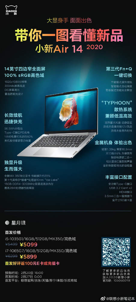 联想小新Air 14 2020是联想小新最新款产品,其搭载了一块14英寸全面屏,sRGB色域达到了100%,分辨率为1920x1080,屏幕亮度可以达到300nit,支持DC屏幕调光;充电续航方面,搭载了一块56.5Wh大电池,采用Type-C接口,1小时电量可充到80%,配置上,它搭载了全新MX350独立显卡,性能提升约20%,配合第十代英特尔酷睿处理器以及16GB DDR4-3200MHz双通道满速内存,性能无忧。
