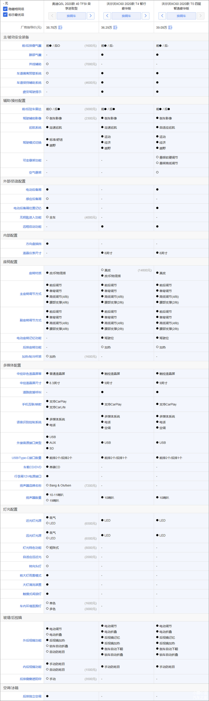 配置差异上,Q5L的优势是可以提供电动后备厢、方向盘换挡、大灯清洗装置、触摸式阅读灯、后排独立空调等;XC60的优势是多出后视镜记忆/电动折叠/倒车自动下翻、主驾驶座电动座椅记忆、远程启动、倒车影像、车道偏离预警系统、车道保持辅助系统、膝部气囊等,后者配置上更有优势。价格与Q5L 40 TFSI荣享进取型接近的XC60 T5四驱智逸豪华版(官方售价39.09万元)相比T4 智行豪华版多出了自适应巡航、电动后备厢等。