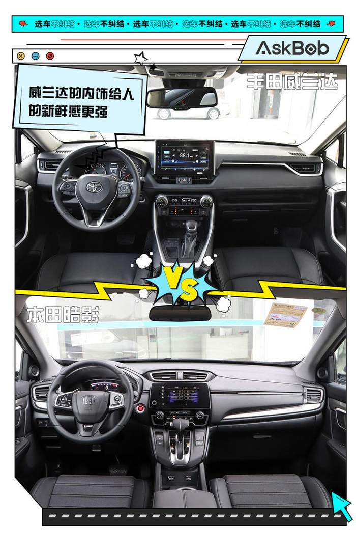 接下来,我们着重要对比一下内饰的配置,这也是很多消费者选车最在意的地方。首先从设计上来说,威兰达的内饰新鲜感更强,毕竟RAV4荣放也刚刚换代,两款车内饰相同。皓影则与 CR-V内饰相同,已经面世多年。