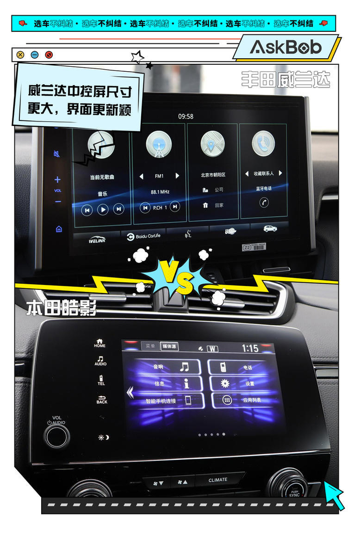 舒适性配置看,皓影有皮质方向盘、更大的液晶仪表盘、前排电动调节座椅,还有车外的电动后视镜折叠,都是加分项,体现出豪华感和科技感。威兰达的中控屏尺寸更大一些,界面也更有新鲜感,不像本田的界面设计多少年都不变。空调带PM2.5过滤,也是时下很流行的配置。综合来看,皓影要稍微有优势一些。