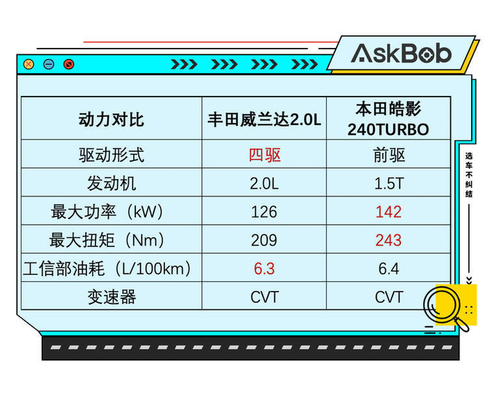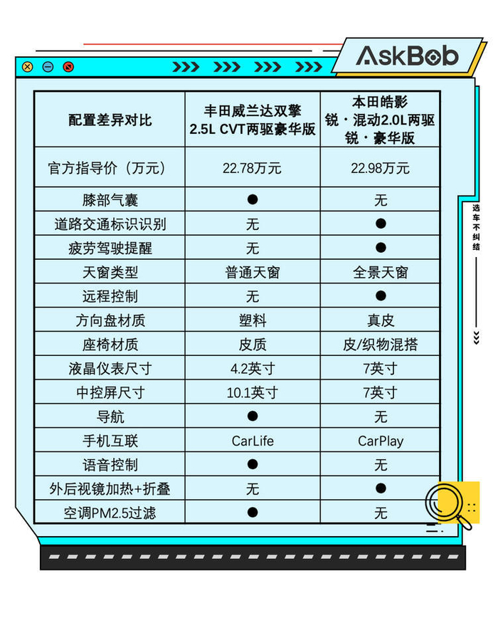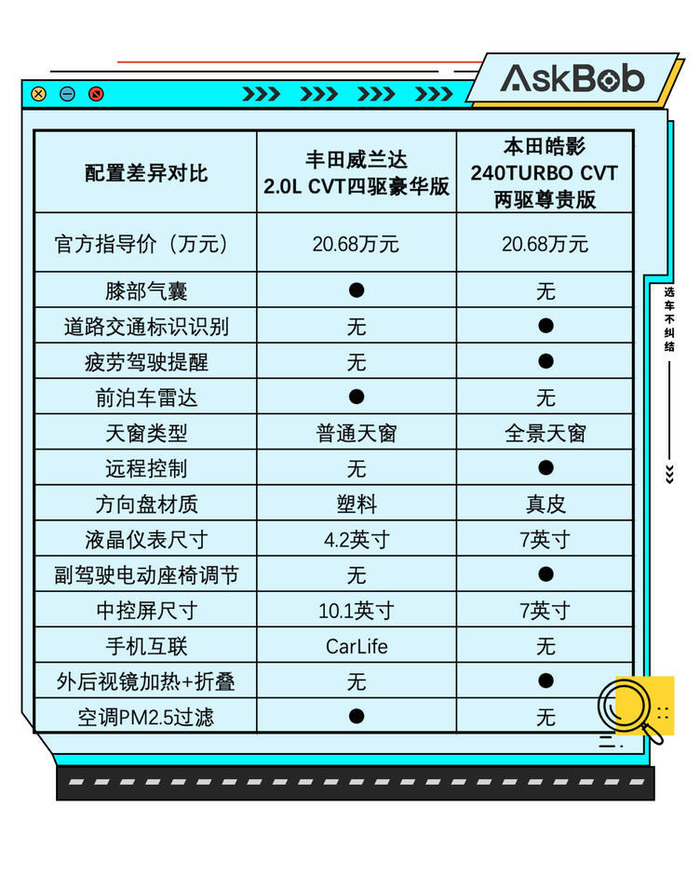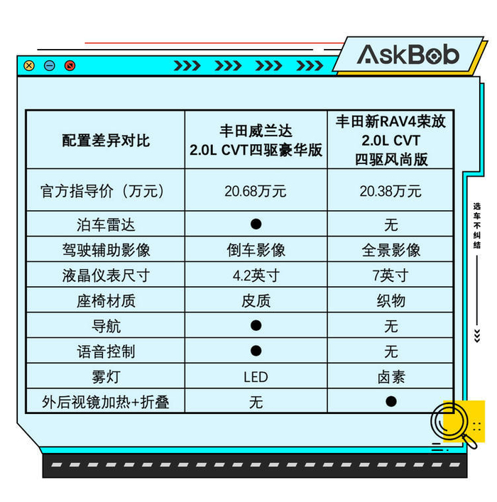 我们挑选了性价比最高的配置来进行对比,威兰达豪华版比RAV4荣放风尚版贵了3000元。从配置差异对比来看,显然是给予了消费者“麦乐鸡”和“麦香鱼”两种套餐选择,各有各的优势,也各有缺点,不能说谁更好,也不能说谁减配。