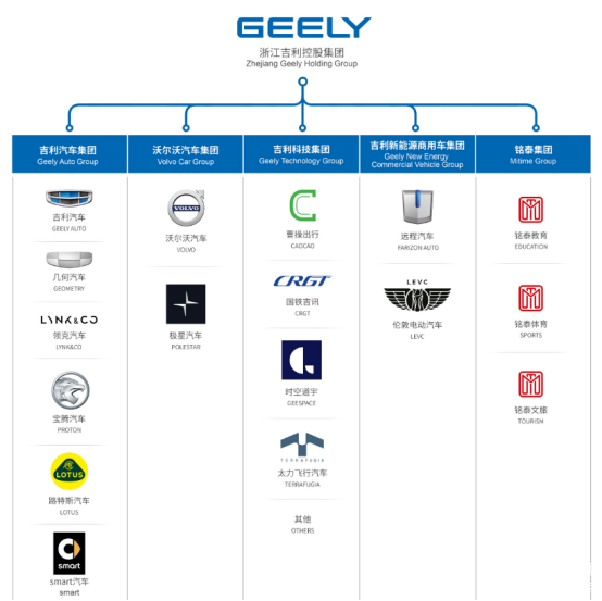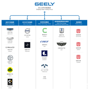 吉利控股旗下目前有五大核心子集团,分别是吉利汽车集团、沃尔沃汽车集团、吉利科技集团、吉利新能源商用车集团和铭泰集团。