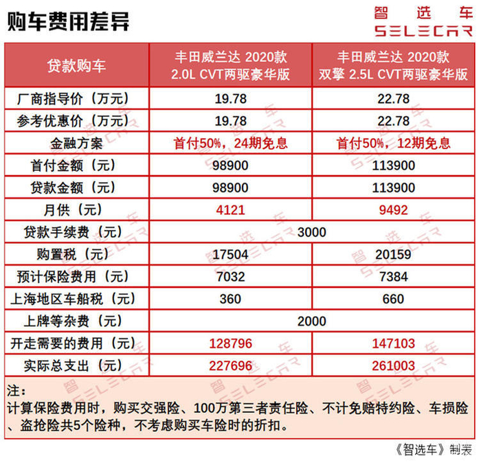 首先在丰田威兰达的配置选择上,小智分别选取了指导价19.78万元的2.0L CVT两驱豪华版和指导价22.78万元的双擎2.5L CVT两驱豪华版,这两款车型的指导价相差了3万元。豪华版作为丰田威兰达全系最值得购买的车型,目前在终端没有优惠。在颜色的选择上,如果选择了铂金珍珠白、墨玉蓝、普通的双色车身,则需要加价2000元;如果选择了铂金珍珠白黑、墨玉蓝银双色车身,则需要加价4000元。本文在计算购车费用时,暂且不考虑这些特殊颜色的加价费用。