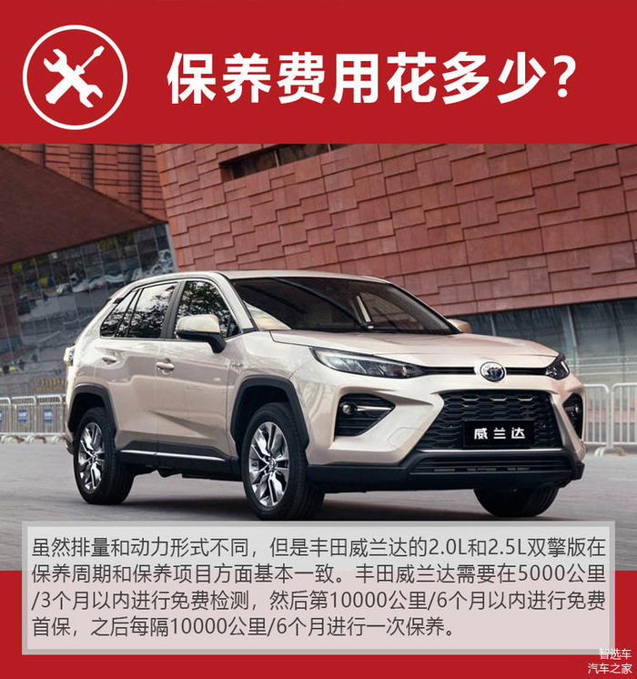 威兰达燃油版和混动版的保养并没有区别,甚至连每次的机油用量都是4.5L。如果真要说保养方面的差异,双擎版车型由于存在动能回收装置,相同里程、相同路况下对于刹车片的磨损更小,保养费用理论上还会更低一些。另外在每次保养时,4S店会对双擎版车型的电池系统进行检测,这是燃油版车型所没有的。由于广汽丰田对非营运威兰达的双擎版升级成了“不限年限、不限里程”的电池质保,所以基本不用担心电池系统后期的额外支出。